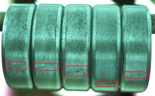 Identification Key Points: Obvious scratches and rough textures on bearing surfaces, with dull and coarse inner raceway walls; loud operating noise that intensifies with more impurities, and even bearing jamming in severe cases. For example, cylindrical roller bearings with such wear show distinct abrasion marks on roller end faces, mostly caused by impurity ingress or poor lubrication.